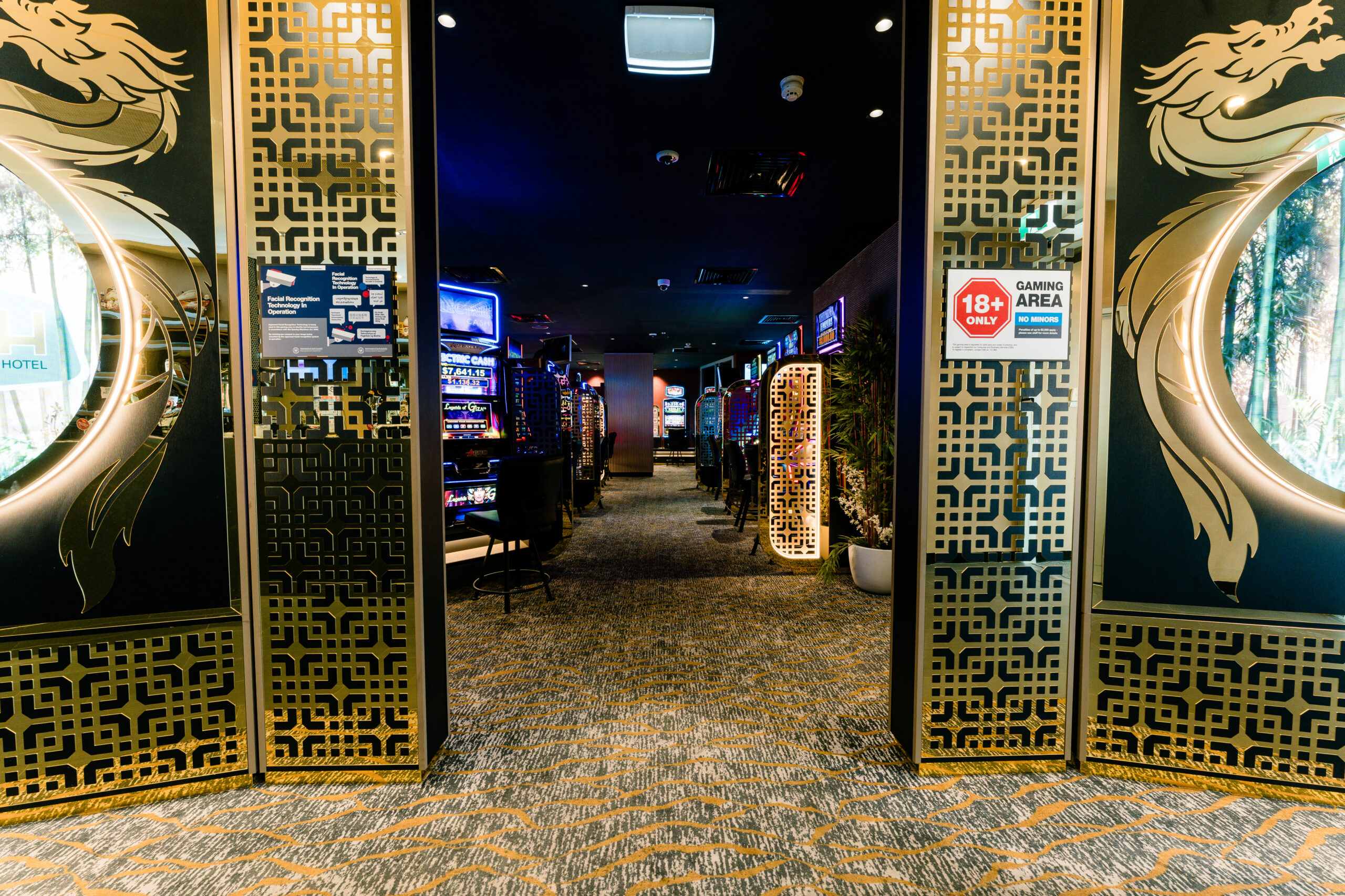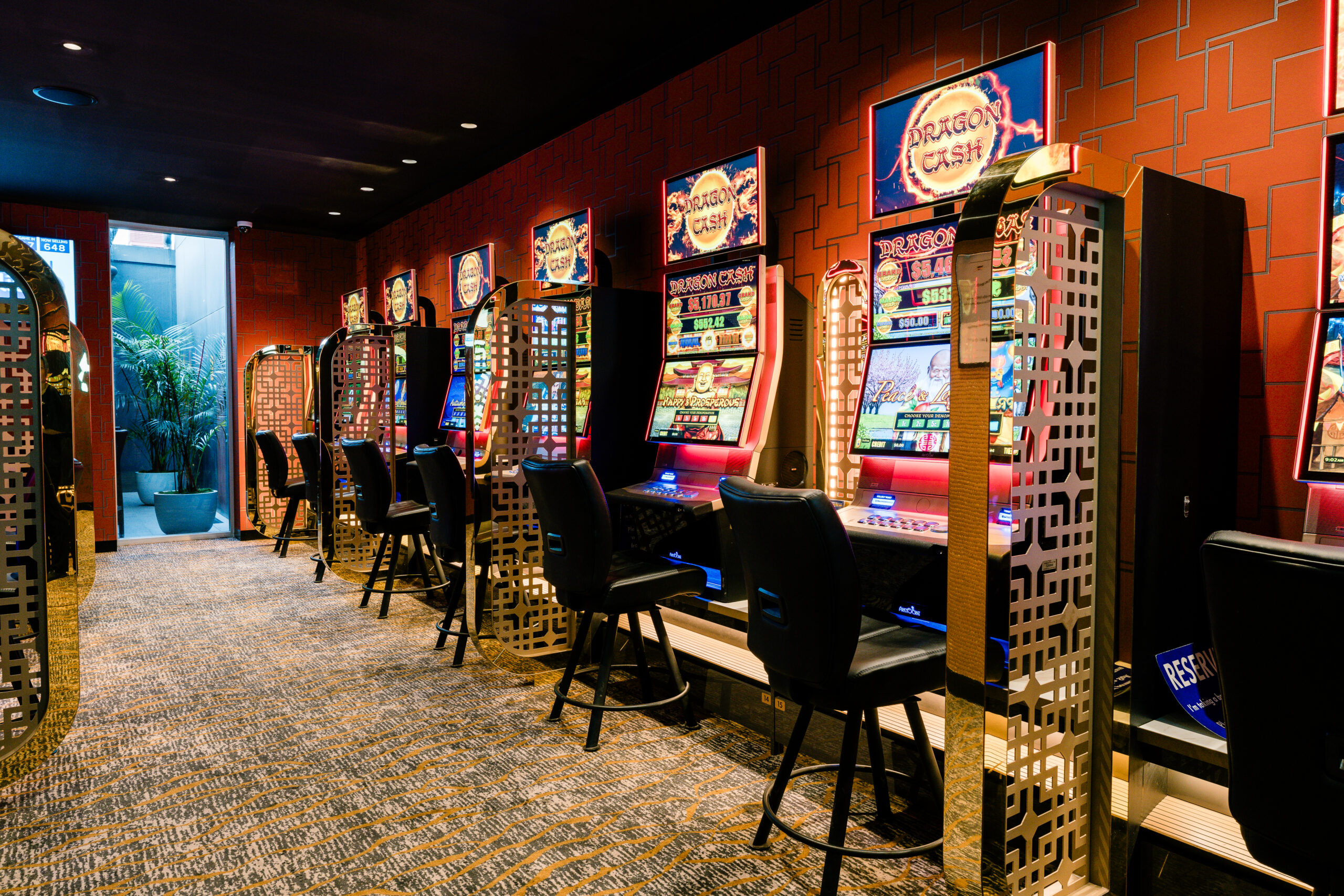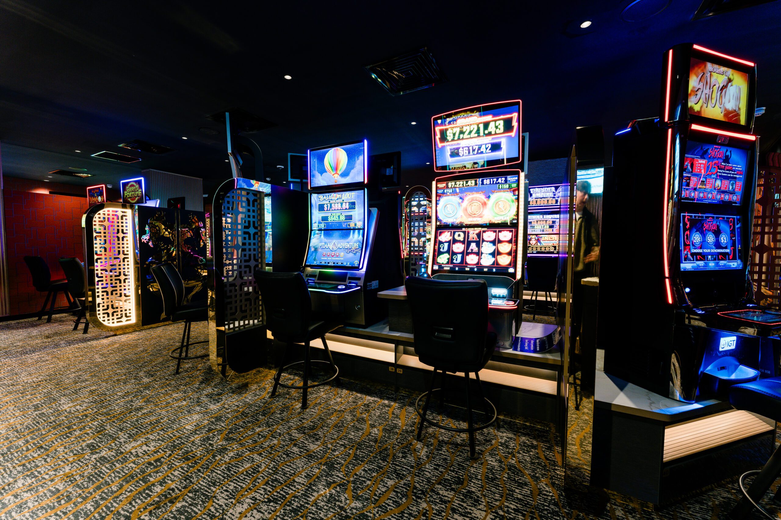 wallpaper, feature lighting, new carpet, fresh floral arrangements, LED entry displays showing machine names, new cupboards, display screens, rryatA smoking area with heating/cooling and comfortable seating is available within the room for added comfort.